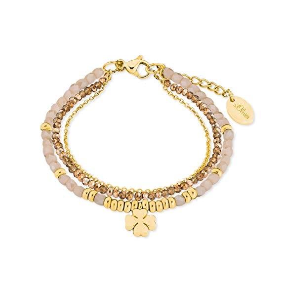 Das Damen-Armband von der Marke s.Oliver besteht aus drei Ketten mit goldenen und hellen Perlen und ist mit einem Glücksklee Anhänger versehen.